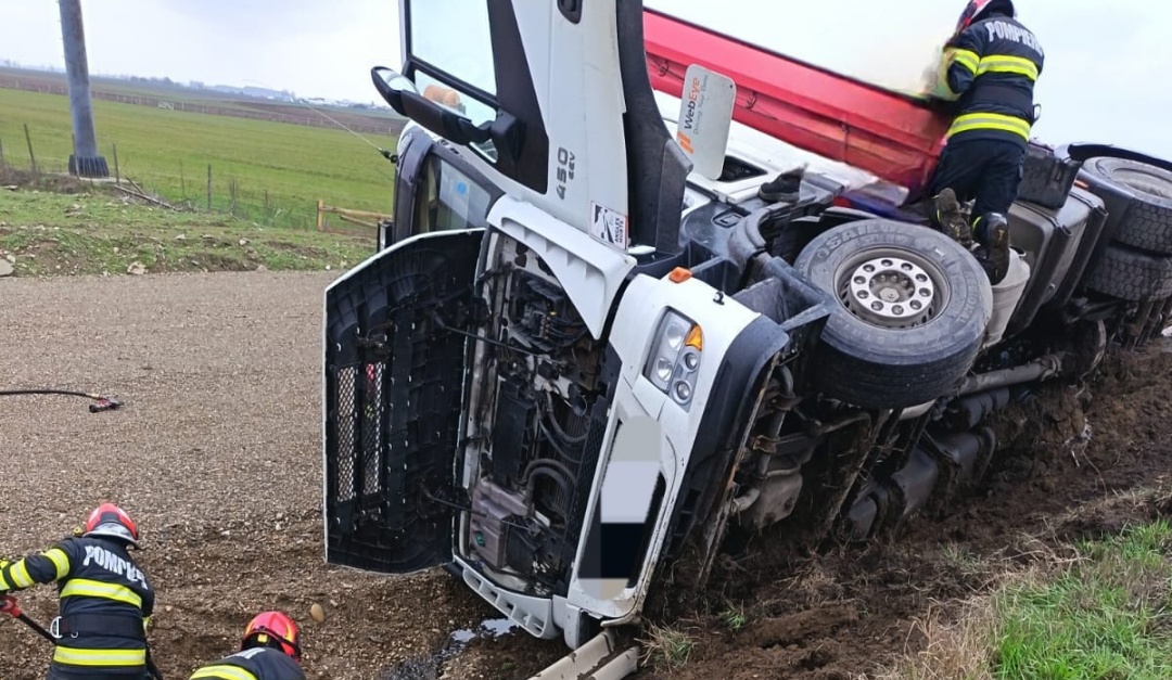 TIR încărcat cu pavele, răsturnat pe E 85 la Horia