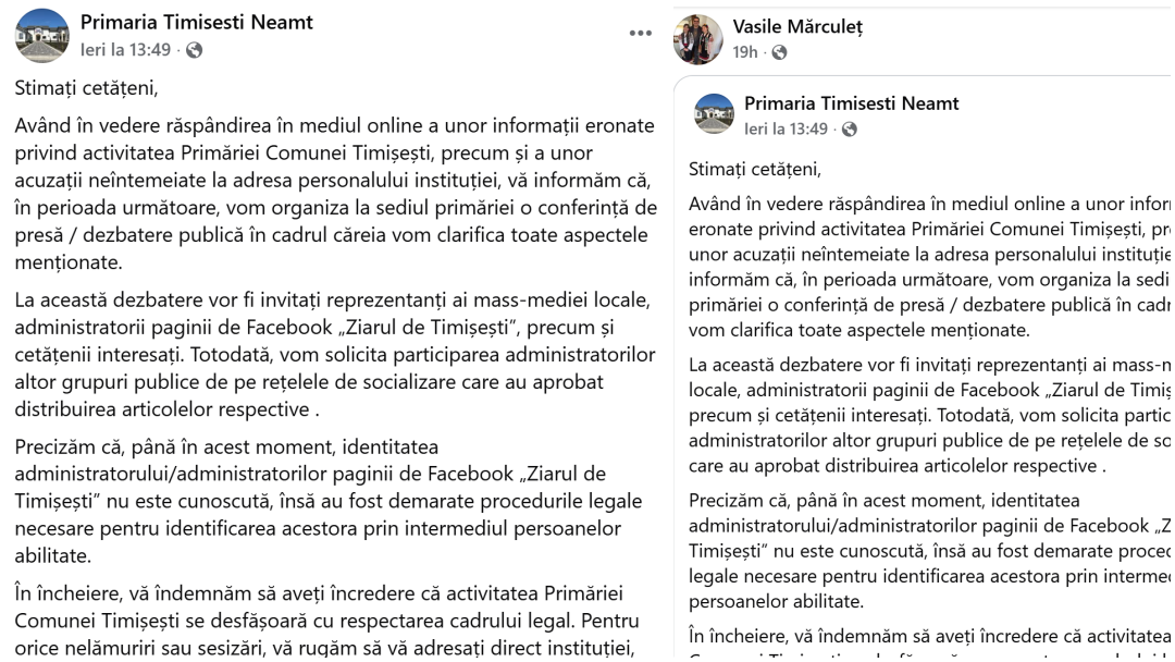 După cum se poate vedea mai sus, Primăria Timișești anunță mare conferință de presă (la tvmneamt.ro nu a ajuns până la acest moment nicio invitație în acest sens) care în mintea celor care au redactat textul, este totuna cu o dezbatere publică. La dezbaterea publică sunt invitați și niște administratori de pagini de facebook (încă neidentificați, dar nu mai contează), dar și cetățenii interesați. Ce să mai, va fi un fel de Festival ”Mărculeț și vinovații”. Un veritabil Tribunal al poporului.