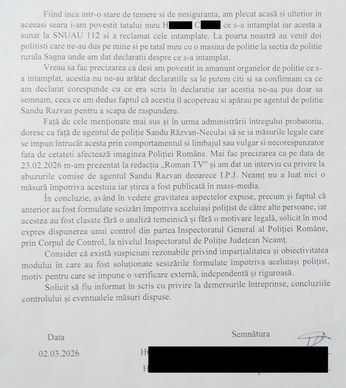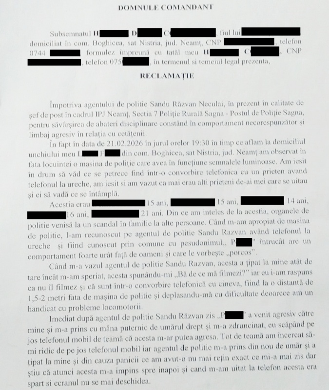 Faptele reclamate de copil și de familia lui, s-ar fi petrecut pe 21 februarie 2026, în comuna Boghicea, satul Nistria. Așa după cum reiese și din una dintre plângerile către autorități (foto- jos), la data respectivă, în jurul orei 19:30, băiatul a văzut din curtea sa, că în apropierea locuinței sunt mai mulți polițiști și autospeciale de poliție cu girofarurile pornite. De curiozitate, a mers spre locul respectiv, pentru a vedea ce se întâmplă (polițiștii interveneau la un scandal), având telefonul la ureche, fiind într-o convorbire telefonică. Printre polițiști se afla și Sandu Neculai Răzvan, șeful de post de la Sagna.