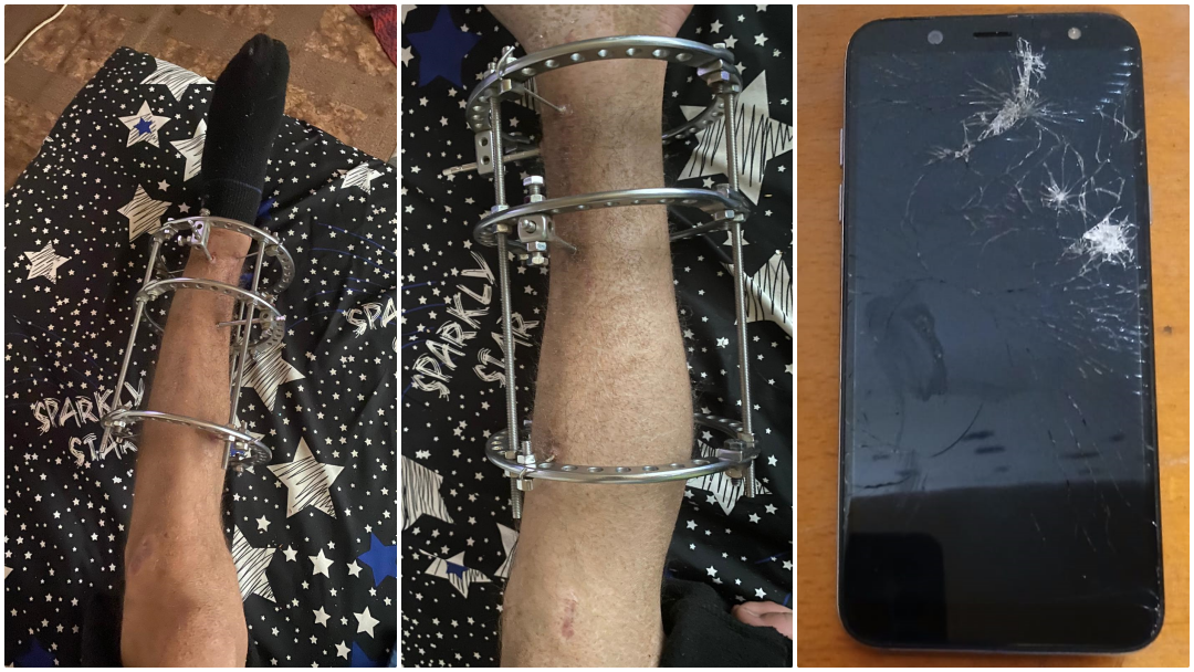 Tânărul a fost victima unui accident rutier, petrecut în urmă cu aproape doi ani, în urma căruia a suferit mai multe fracturi la ambele picioare. De doar câteva luni a început din nou să se deplaseze singur, însă cu mare greutate, pentru că se află încă în perioada de recuperare, având montate pe picioare niște dispozitive metalice pentru fixarea oaselor, după cum se poate vedea în imaginile de mai jos.