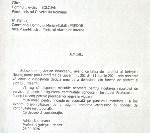 Prefectul de Neamț, avocatul Adrian Bourceanu, a demisionat din funcție, astăzi, după ce Sorin Grindeanu le-a cerut ieri prefecților PSD din țară să demisioneze. Decizia lui Grindeanu vine ca urmare a ieșirii PSD de la guvernare și după ce social democrații au anunțat că depun o moțiune de cenzură, împreună cu AUR, pentru demiterea premierului Bolojan. ”În contextul deciziilor luate de conducerea PSD Neamț, mi-am depus demisia din calitatea de prefect al județului Neamț, calitate în care am avut onoarea să activez timp de 2 ani și 16 zile.
